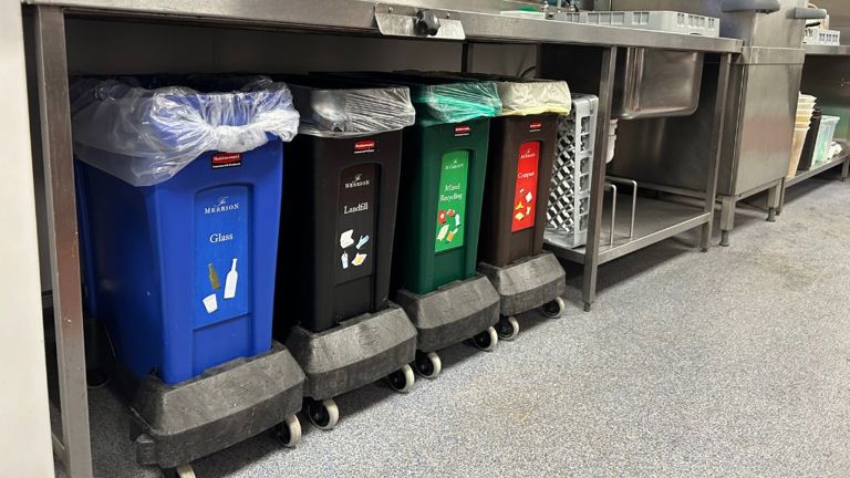 Group of people in uniform standing behind recycling bins in a leisure center